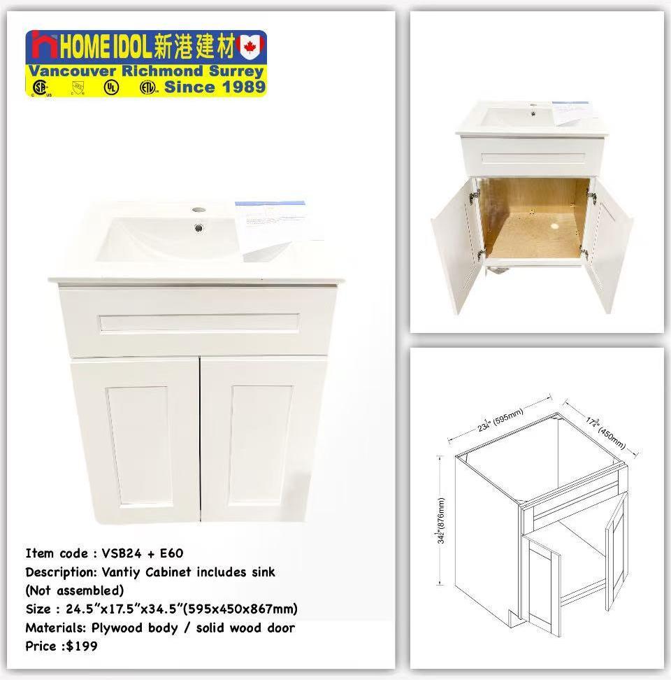 V24 24" Vanity Combo $199(VSB24 + E60/60E) 595mmW x 876mmH x 450mmD 24-1/4"W x 34-1/2"H x 17-3/4"D (solid wood door, plywood body and dovetail drawer best in the industry) A6